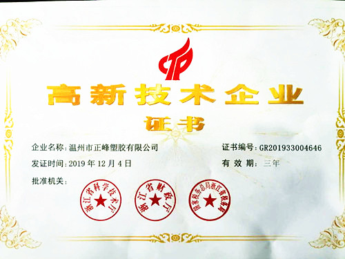 近日,正峰塑膠順利通過“高新技術企業(yè)”復評認定,對提升公司科技水平,增強綜合實力,打造專業(yè)優(yōu)勢,提高行業(yè)地位,樹立品牌形象具有積極意義。